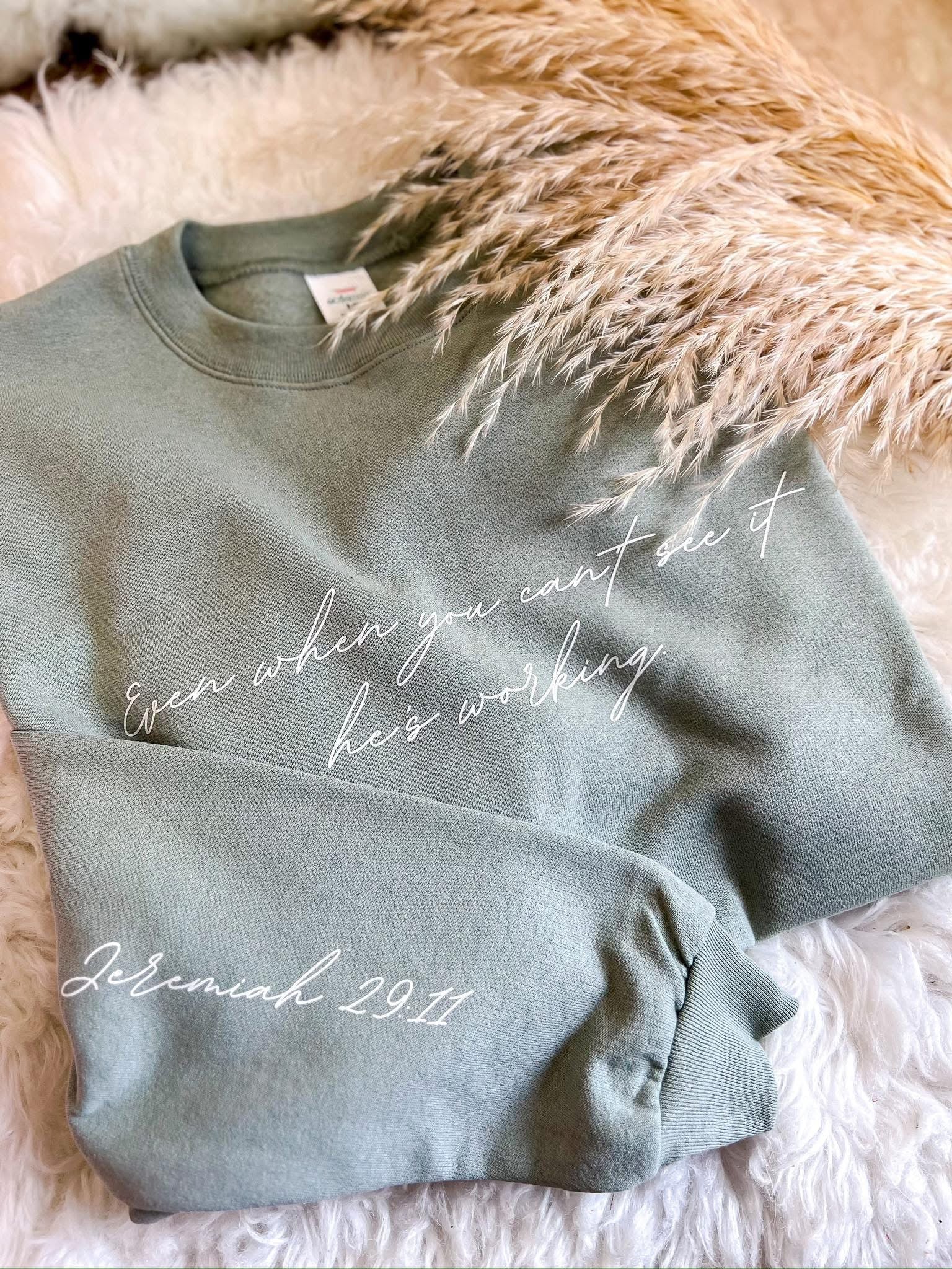 He's Working Sweatshirt When life takes unexpected turns, find comfort in faith and hope. This meaningful sweatshirt draws inspiration from Jeremiah 29:11, reminding you that even during challenging moments, there's a greater purpose at work. Perfect for daily wear or as a thoughtful gift for someone navigating life's uncertainties. Soft, cozy, and designed to uplift your spirit. **Pre-order closes 12/12 | 5-10 business day turnaround**