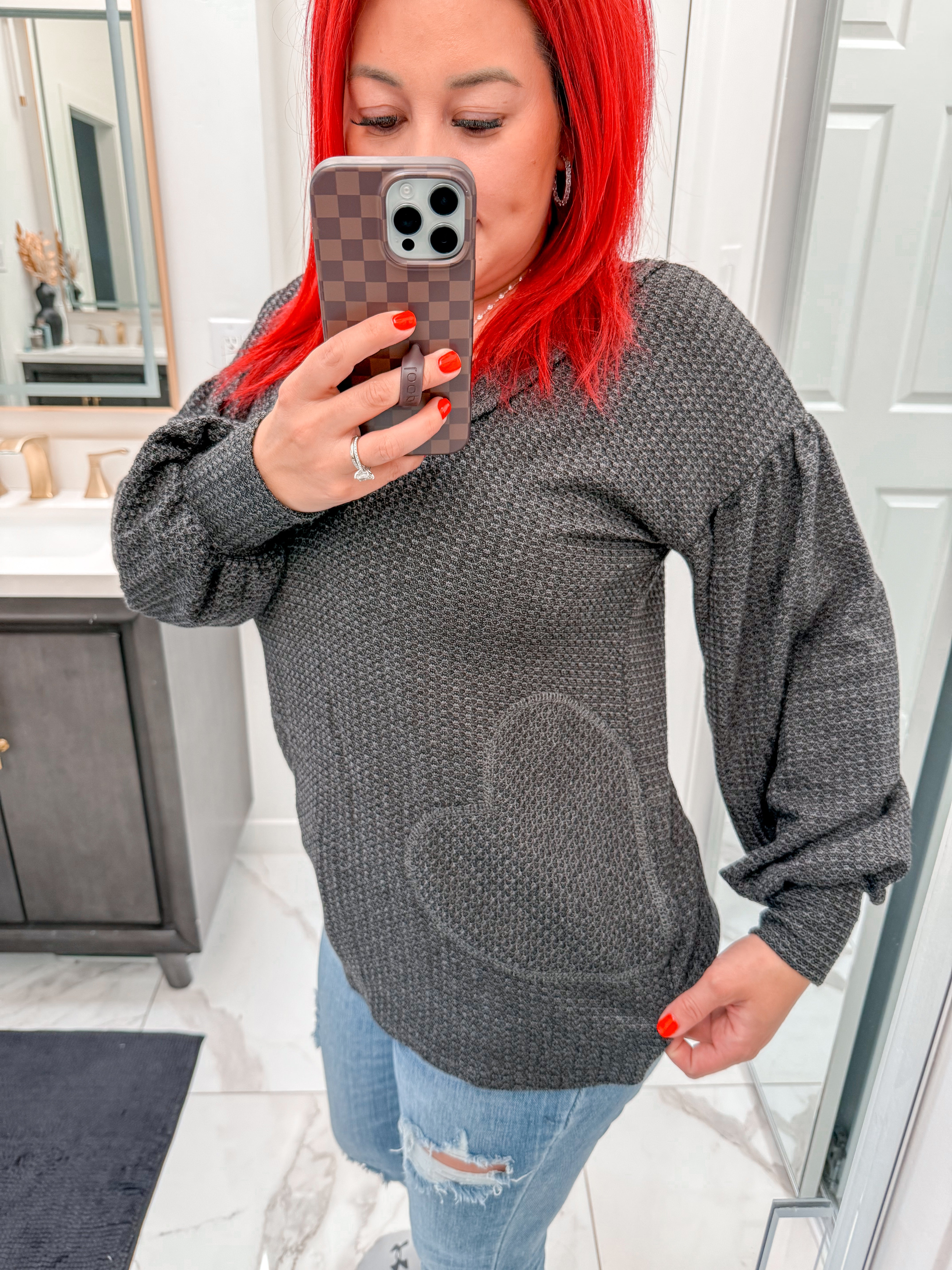 The Lumi Top is your new go-to for effortless cool. This two-toned charcoal waffle knit brings texture and dimension to your everyday rotation, while the adorable heart-shaped side pocket adds a cheeky touch of personality. Cozy, cute, and ready for whatever adventure comes your way.