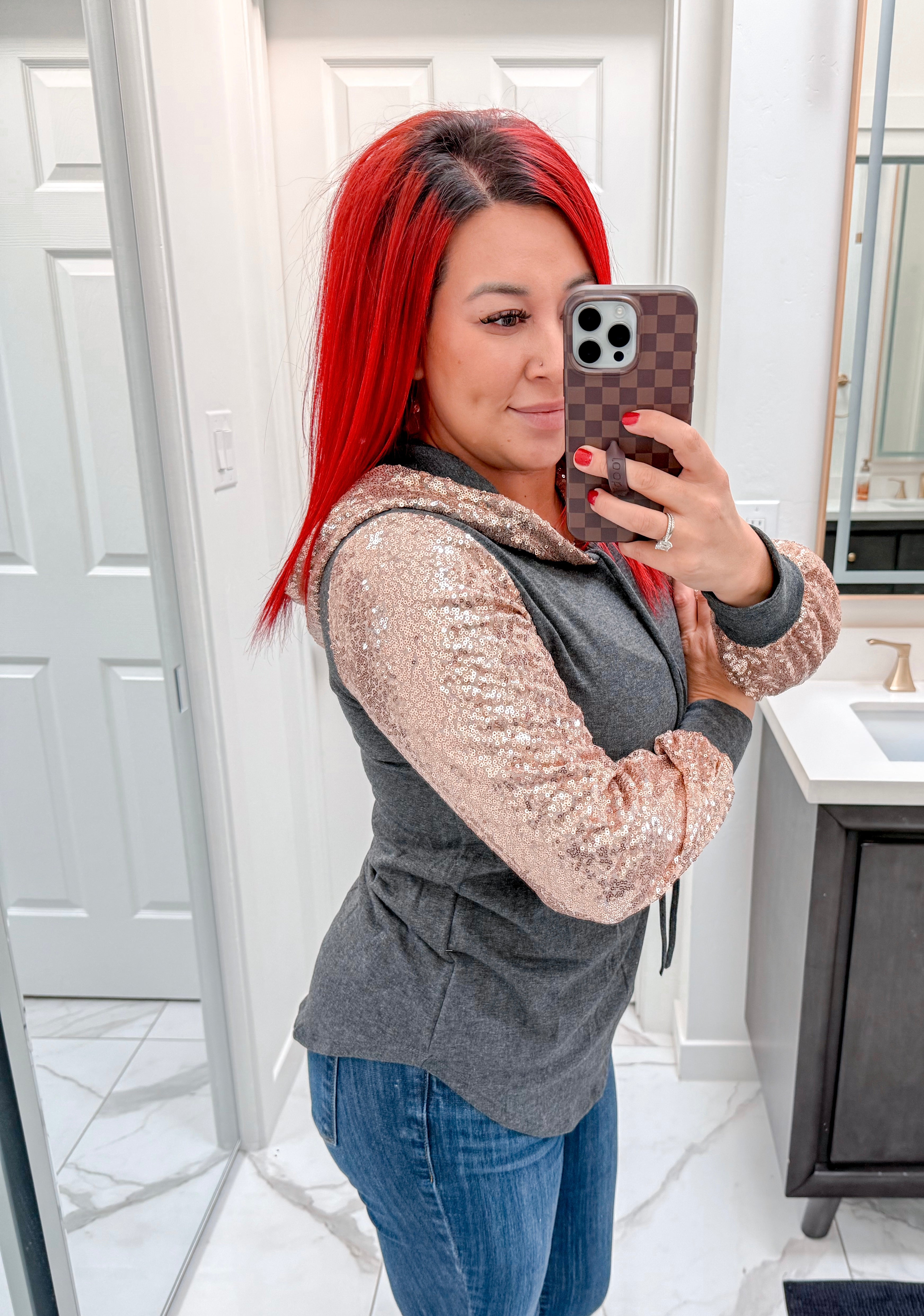 The Raylee Hoodie brings effortless style with a luxe twist. This charcoal hoodie features eye-catching rose gold sequins scattered across the front, adding just the right amount of sparkle to elevate your everyday look. Perfect for those moments when you want to feel confident and a little extra, the sequin detailing catches the light beautifully while the soft hoodie keeps you cozy. Whether you're heading out for a casual day or want to add some glam to your wardrobe, the Raylee delivers comfort without compromising on style.