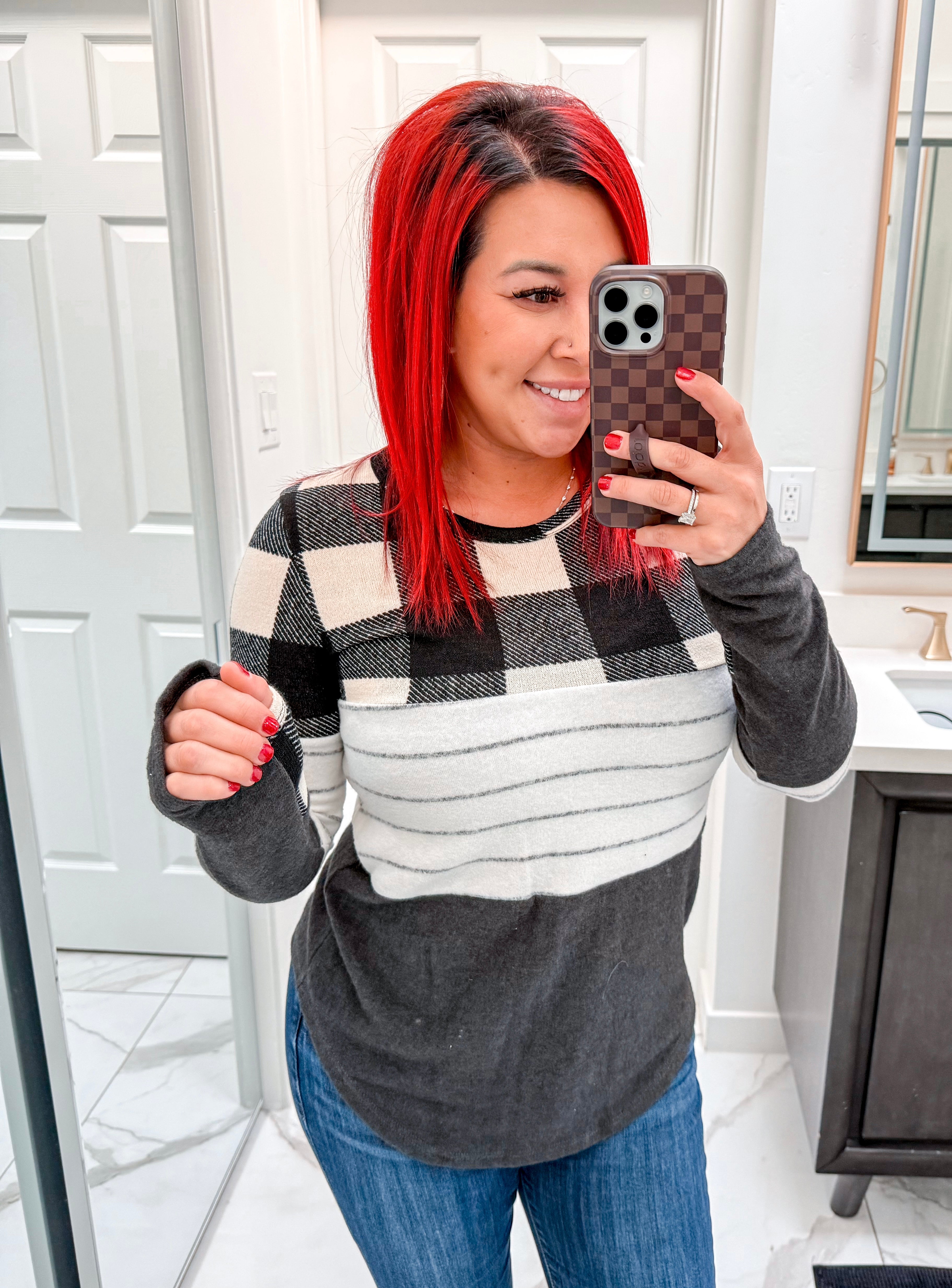 The Saylor Top brings effortless style to your everyday wardrobe. This plaid striped design features a flattering silhouette with practical thumbholes that keep sleeves in place during active days. Perfect for layering or wearing solo, it's a versatile piece that transitions seamlessly from casual outings to relaxed weekends. The supportive fit ensures comfort all day long, making it an essential addition to your closet.